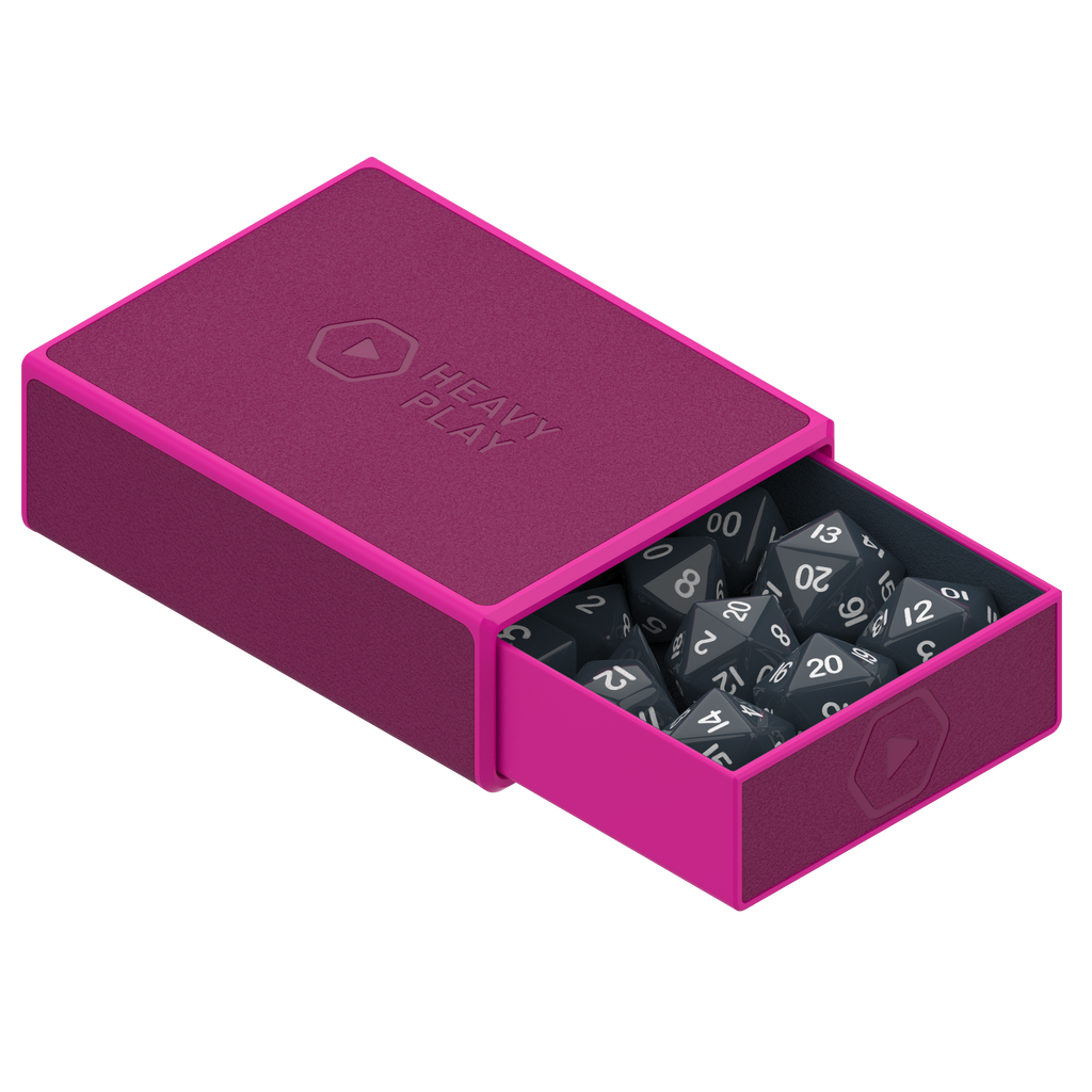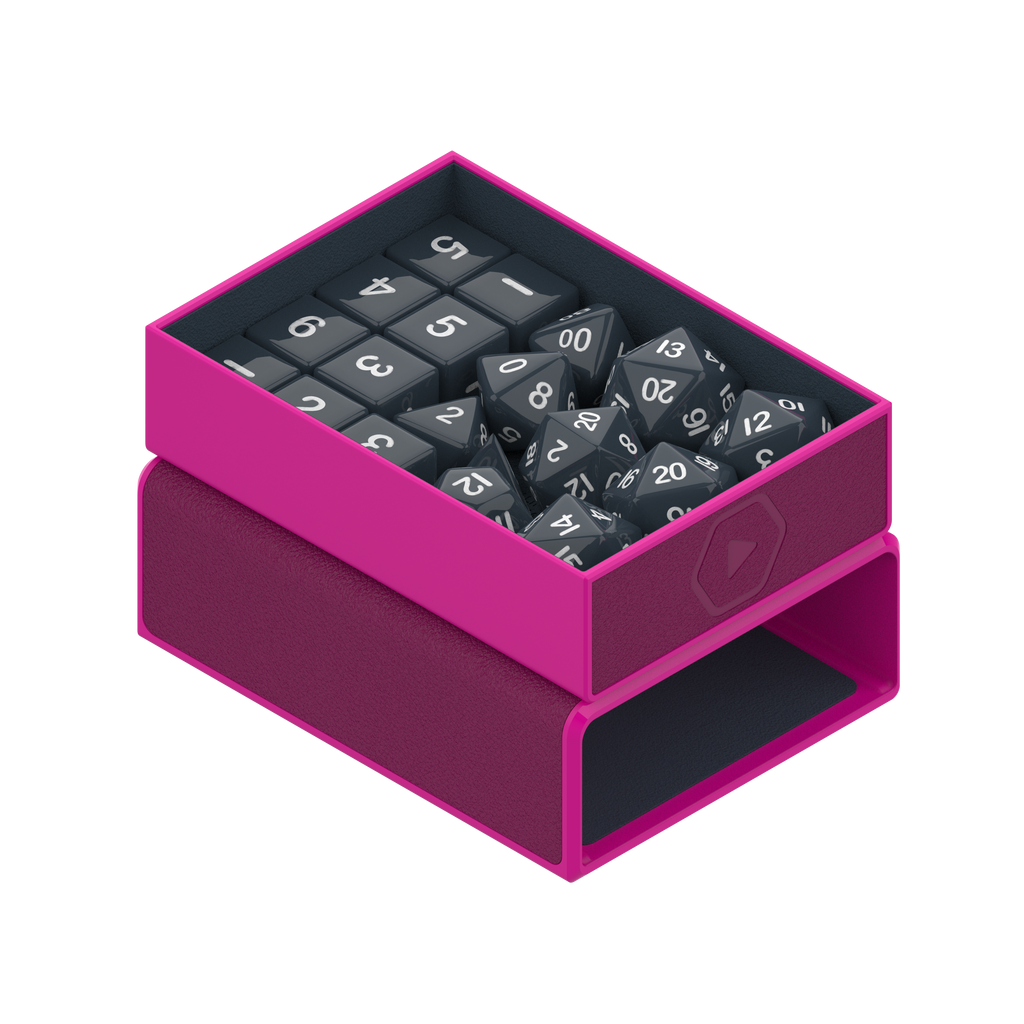 The ultimate dice box. Fits 4x D20 spindowns, a full set of 7x RPG dice, and a bunch of extra D6's or tokens. Magnetic tray slides out and pops on top for easy dice access during gameplay. Durable vegan leather exterior. Soft microfiber lining to dampen rattling.