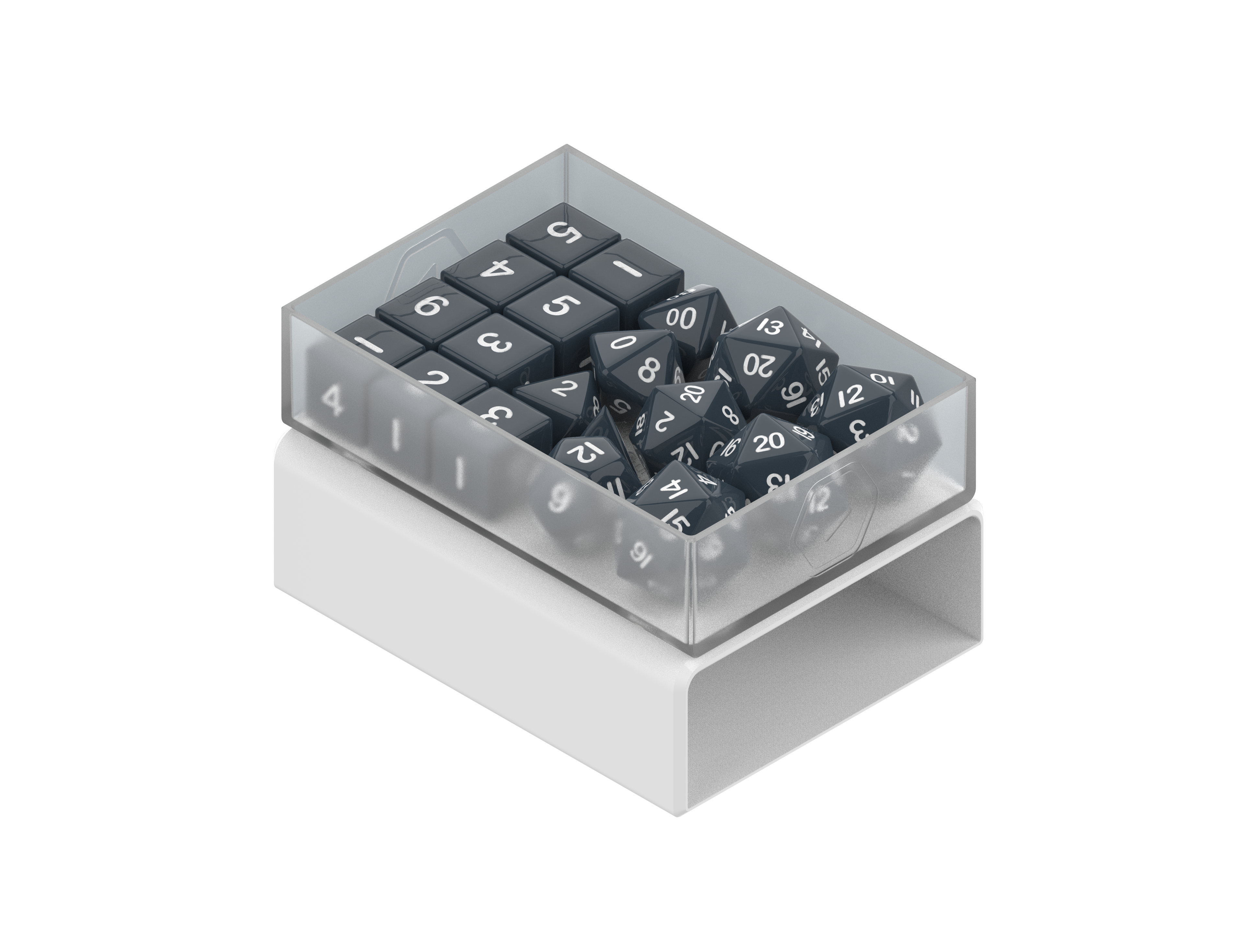 Pack all the dice you need. Fits 4x D20 spindowns, a full set of 7x RPG dice, and a bunch of extra D6's or tokens. Magnetic tray slides out and pops onto shell for easy dice access during gameplay. Durable polycarbonate structure. Translucent tray to showcase dice.